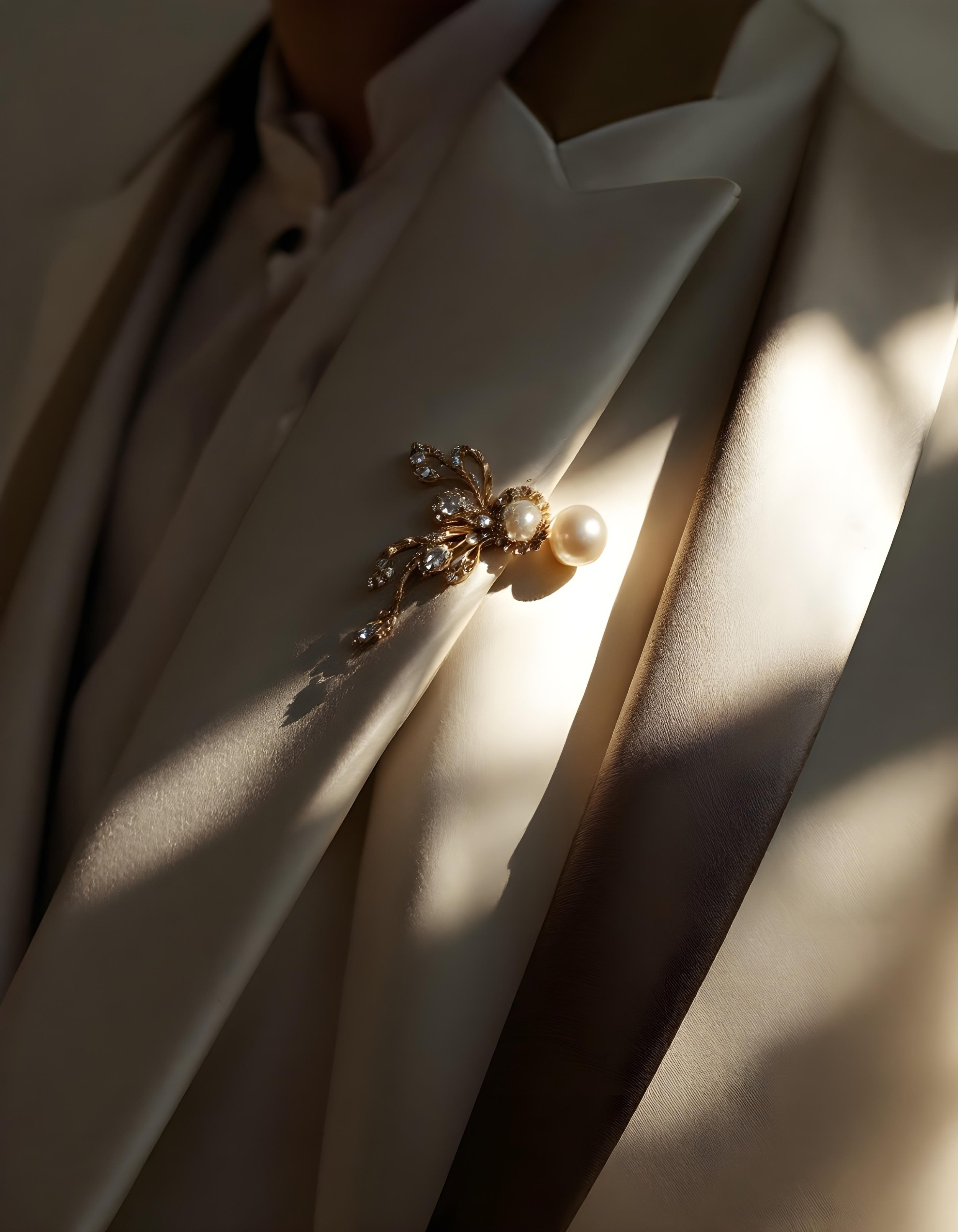 Ultra-wealthy men often wear antique stick pins with pearls, small diamond clusters, or commissioned brooches from heritage jewellers. They are always positioned on the left lapel, maintaining timeless etiquette.